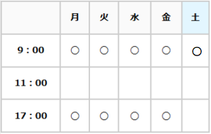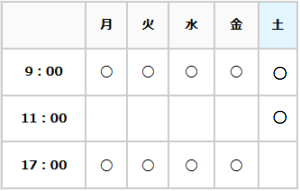 | 09:00~12:30 | ◯ | ◯ | ◯ | × | ◯ | ▲ | × | × |